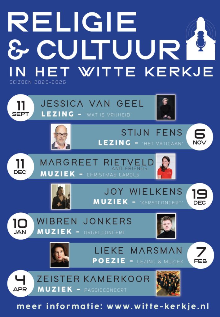 Wees welkom bij het programma ‘Religie & Cultuur’ in Het Witte Kerkje in Huis ter Heide. Ook komend seizoen (2025-2026) organiseren we een reeks inspirerende activiteiten -zowel lezingen als concerten- waarin cultuur, zingeving en maatschappelijke thema’s samenkomen. Zo is ons schitterende kerkje aan de Amersfoortseweg opnieuw een open ontmoetingsplek en een cultureel podium.