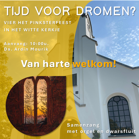 Valt er nog wat te dromen? Daar zal het over gaan in de dienst van Pinksteren. We vieren dat geestkracht en bezieling jong en oud aanzet tot dromen en vergezichten. En het blijft niet bij dromen… Nieuwsgierig geworden? Van harte welkom. Er is mooie muziek op orgel en fluit en voorganger is onze predikant ds. Ardin Mourik. Na afloop koffie en thee.